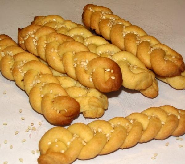 500 g mąki125 g margaryny125 g smalcu125 g cukru pudru6 żółtekaromat waniliowysezam do posypaniaMąkę rozetrzeć z margaryną i smalcem, dodać żółtka, i cukier oraz aromat i zagnieść twarde ciasto.Dzielić na kawałki, formować cienkie wałeczki o długości ok 15 cm i zaplatać z nich warkoczyki. Przed pieczeniem posypać lekko sezamem . Piec na złoty kolor ok 20 min.