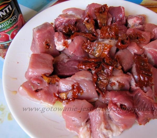 Mięso rozłożyć w naczyniu, posypać pokrojoną
