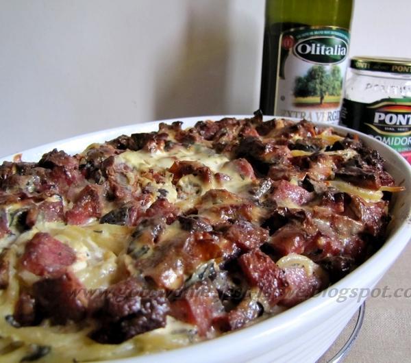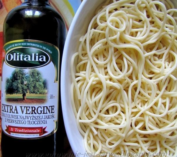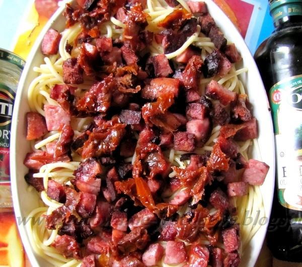 Formę do zapiekanek nasmarować oliwą z oliwek Olitalia . Włożyć makaron, skropić oliwą i przemieszać delikatnie ręką. Wędliny pokroić drobno i przyrumienić na patelni. wyłożyć wędlinę na makaron (bez tłuszczu) Po wierzchu rozłozyć pokrojone drobno pomidorki suszone Ponti.