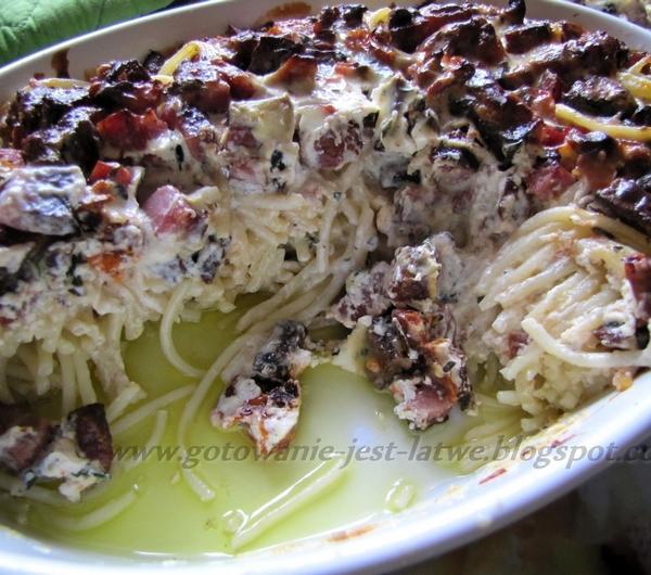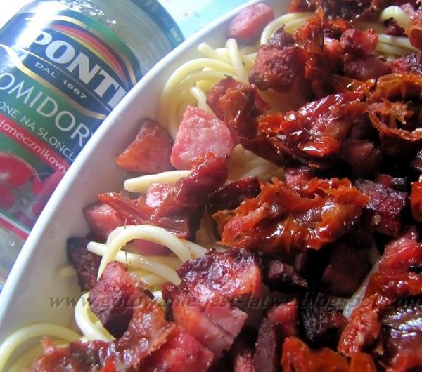 pół opakowania makaronu spaghetti Arrighioliwa z oliwek Olitaliakilka pomidorków suszonych w oleju Ponti200 g różnej wędlinysólpieprz300 ml śmietany1 jajkoszczypta majerankułyżka oregano