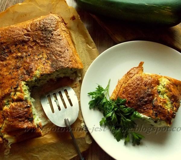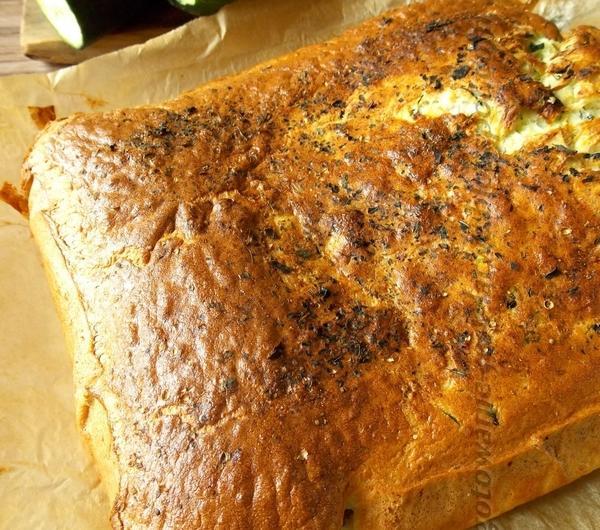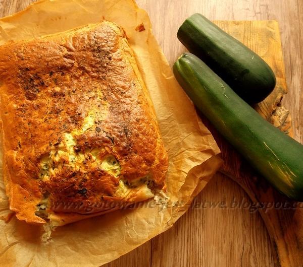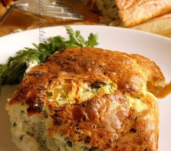 2 cukinie ok 800 g1 szkl mleka1 szkl mąki1 szkl białek1/3 szkl oleju100 g sera feta1 ząbek czosnkupół cebulisólpieprz1 łyżeczka proszku do pieczenianatka pietruszkiświeże zioła (majeranek, bazylia, mięta)Cukinie zetrzeć na tarce o grubych oczkach, posolić, wymieszać i odstawić by puściła sok.Odcisnąć na durszlaku (lekko)Z mąki i mleka rozmieszać ciasto, dodać drobniutko posiekaną cebulę i rozgnieciony czosnek.Ser pokruszyć , dodać proszek do pieczenia, przyprawy , zioła i olej. Następnie ubić pianę z białek i dopiero dodać odciśniętą cukinię i pianę z białek. Wymieszać i wyłożyć do formy do zapiekanek lub brytfanki wyłożonej papierem. Posypać bazylią i oregano. Piec ok 45 min w temp 180 st.. pod koniec można obniżyć do 150 st gdyby zaczynała się za bardzo podpiekać.Podawać z sałatką z pomidorów.
