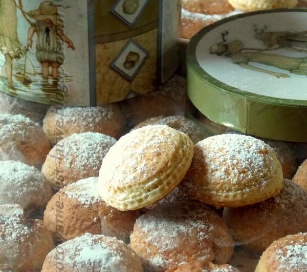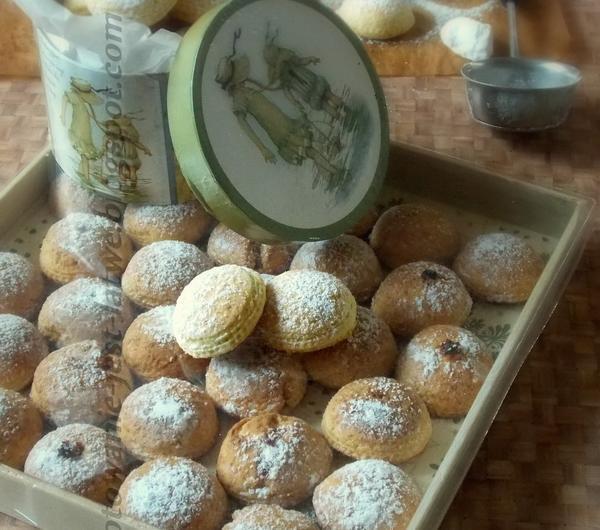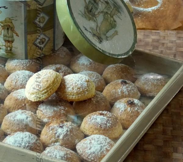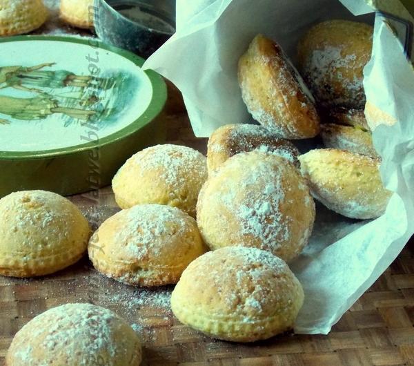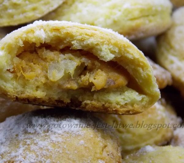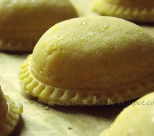 2 łyżki bułki tartejZ podanych składników zagnieść dość twarde ciasto.Batata ugotować , obrać ze skórki, rozgnieść widelcem, orzechy utłuc w moździerzu , dodać do masy, dodać cukier, otartą skórkę z cytryny i bułkę tartą (ale tylko wtedy gdy masa jest zbyt rzadka.Wymieszać. Wałkować cienko i formować ciasteczka w kształcie ravioli lub małych pierożków.Piec na złoty kolor, posypać cukrem pudrem.