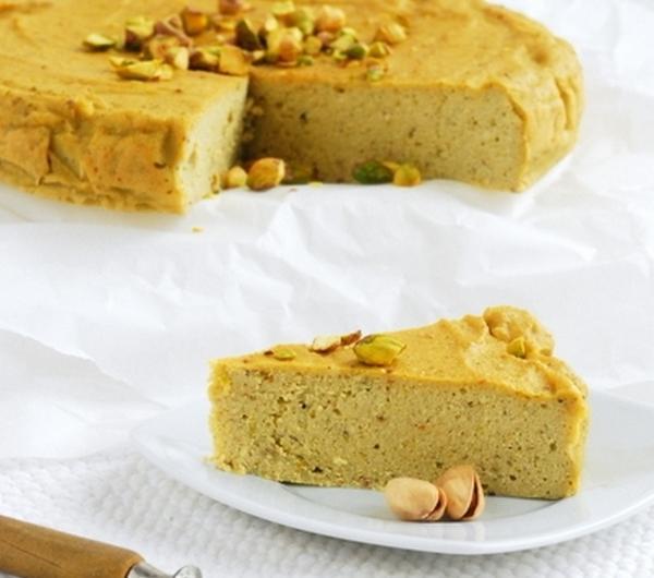 Składniki (tortownica 20-22 cm)Z 550 g naturalnego tofu80 g obranych niesolonych pistacji2 duże jajka (lub 3 małe)1 łyżka oleju z pestek winogron (niekoniecznie)1 łyżka mąki ziemniaczanej80 g ksylitolu20-35 kropel stewii fluid (do smaku)M 1 łyżka ekstraktu z waniliiW malutka szczypta soli morskiejsproszkowana spirulina (na końcu noża, dla wzmocnienia koloru)D odrobina soku z cytrynyO szczypta kurkumyPistacje zmiksować na gładką masę (ja robię to w pojemniku od blendera). Może to potrwać kilka minut. Jeśli orzechy nie będą chciały się ładnie zmiksować, można dodać łyżkę oleju.Tofu zmielić w maszynce lub zblendować na gładką masę, dodać jajka, ksylitol oraz dodatkowo stewię, a następnie mąkę ziemniaczaną i pistacje. Doprawić wanilią, szczyptą soli. Ewentualnie dodać także sproszkowaną spirulinę, aby zielony kolor był bardziej intensywny (bądźcie jednak ostrożni, aby od spiruliny sernik nie nabrał specyficznego zapachu). Na końcu dodać sok z cytryny i kurkumę. Wszystko razem zmiksować na jednolitą masę.Tortownicę wykładam papierem do pieczenia, zawijając nadmiar papieru. Dzięki temu brzegi są artystycznie nierówne :) Ale równie dobrze można pominąć papier w ogóle, ewentualnie lekko nasmarować boki tortownicy masłem lub, najlepiej, użyć formy silikonowej. Masę przelać do formy, wyrównać (upiecze się z widocznymi wszystkimi niedoskonałościami wierzchu!). Piec w piekarniku nagrzanym do 170°C przez 40-45 minut. Studzić w uchylonym piekarniku. Przechowywać w lodówce.