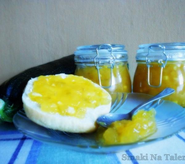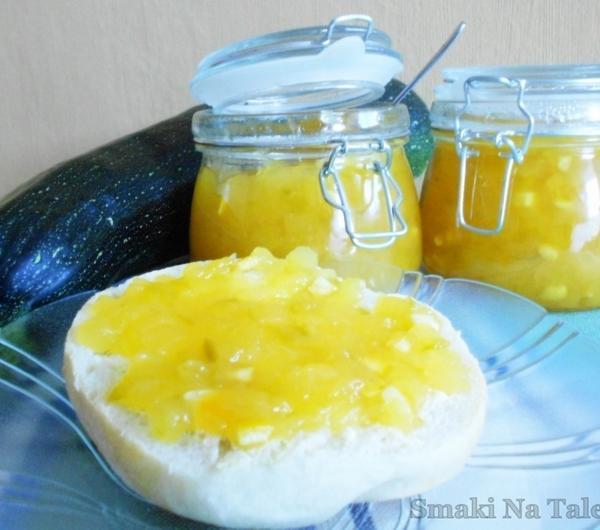 cukinii zetrzeć na tarce o grubych oczkach, a drugą połowę pokroić w niezbyt dużą kostkę. Gotować w garnku najpierw na większym ogniu od czasu do czasu mieszając, by masa nie przywarła do dna. Jak już się zagotuje, to zmniejszyć płomień.Gdy cukiniowa masa zgęstnieje i będzie bardziej jednolita, dodać