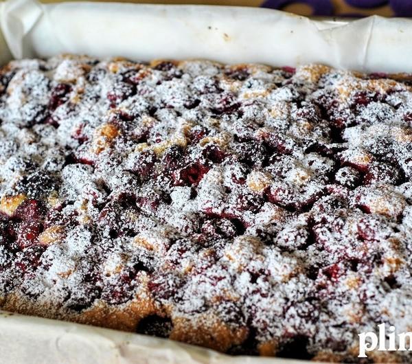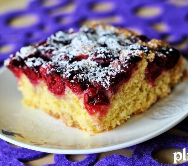 - 300 g mąki- 200 g cukru- 70 g wiórków kokosowych- 220 g miękkiej margaryny- 3 jajka- 1 opakowanie budyniu śmietankowego- 3 łyżeczki proszku do pieczenia- 3 łyżki mleka- 700 g wydrylowanych wiśni- 3 łyżki cukruPrzygotowanie:Do mąki dosypać wiórki kokosowe, budyń i proszek do pieczenia.Margarynę utrzeć z cukrem, dodać po jednym jajku oraz mleko, miksować ok 2-3 minut.Do masy dodać suche składniki, następnie wymieszać wszystko mikserem na najwyższych obrotach.Ciasto powinno być dosyć gęste.Prostokątną blachę o wymiarach ok. 25x35 cm wyłożyć papierem do pieczenia, następnie wyłożyć ciasto, dokładnie rozprowadzając je na całej powierzchni.Na wierzch ciasta wyłożyć wiśnie i posypać 3 łyżkami cukru.Piec w piekarniku rozgrzanym do temperatury 180 °C przez ok. 60 minut.Ciasto po wystygnięciu posypać cukrem pudrem.