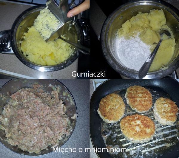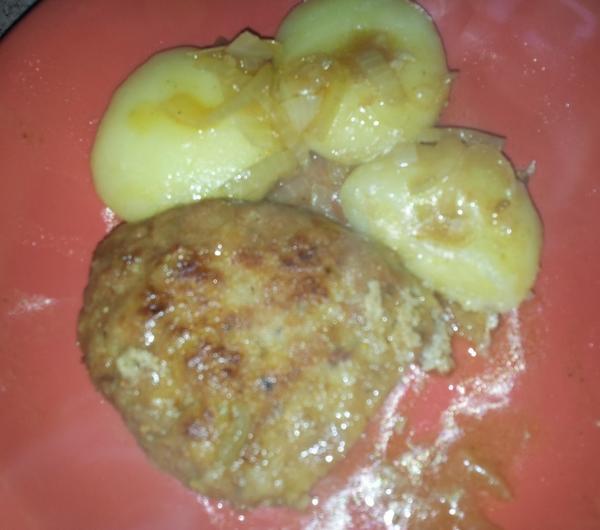 Gotujemy ziemniaki. Dajemy im całkiem ostygnąć. Traktujemy je praską do ziemniaków albo jak ktoś nie ma owego narzędzia tortur to tłuczkiem (mniej boli). Uklepujemy ziemniaki na równo i dzielimy na cztery części, jedną wydłubujemy i wsypujemy na równo mąki ziemniaczanej - robimy jednolite ciasto. Do wrzącej i osolonej wody wrzucamy średniej wielkości uformowane kuleczki z dziurką :) i czekamy do wypłynięcia.Kotlety mielone robię tak: cebulkę drobniutko kroję i dodaje do mięsa. Namaczam bułkę w mleku lub wodzie, odcedzam i dodaje do mięsa. Potem jajko, sól i pieprz. Wszystko mieszamy swymi czystymi rączkami. Formujemy kotleciki i obtaczamy w bułce tartej i smażmy.Można zrobić sos do klusek - na patelnie dać pokrojoną cebulę i poddusić. Łyżkę mąki rozrobić z wodą i dodać do cebulki. Dodać jakieś przyprawy i na koniec dać do tego kotlety i wszystko razem poddusić.Smacznego!
