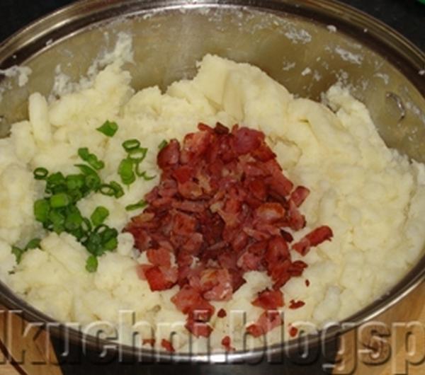 Składniki:1 kg ziemniaków140 g bekonu bez skóry20 g masła60 ml śmietany1 łyżka posiekanego szczypiorkuUgotuj ziemniaki.Bekon pokój w kostkę i podsmaż na suchej patelni.