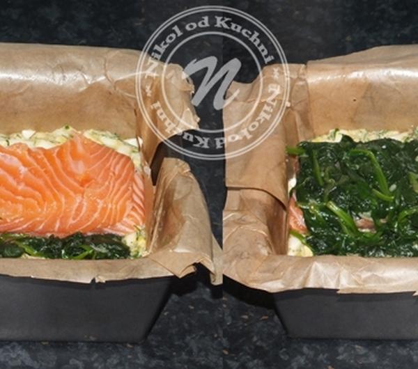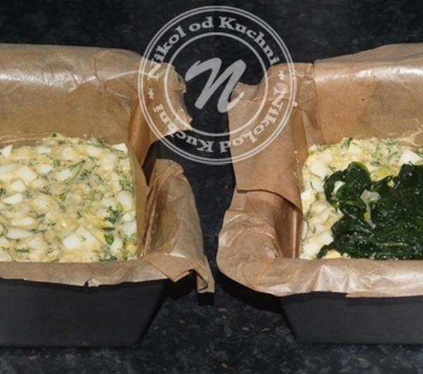 Keksówkę (10x25 cm) wyłóż papierem do pieczenie i posmaruj go olejem. Na dno wyłóż połowę masy jajecznej, a na środku ułóż połowę szpinaku.