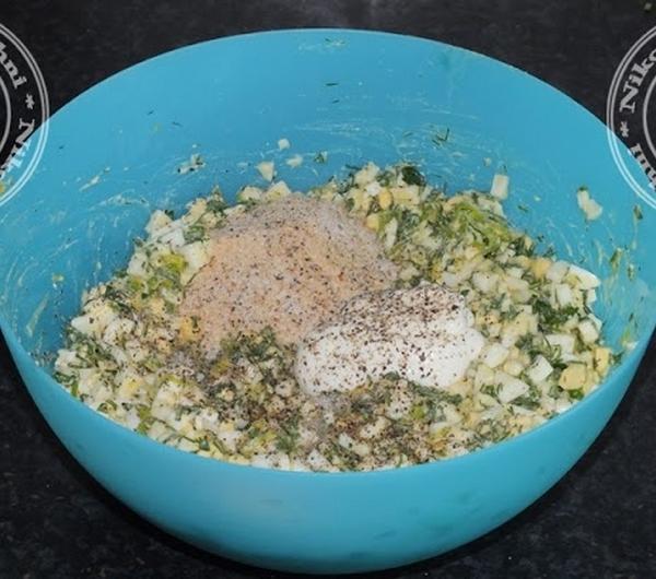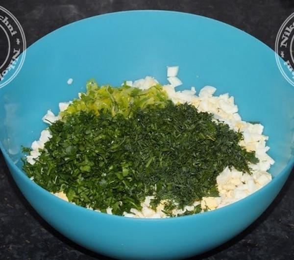 W dużej misce wymieszaj jajka pokrojone w małą kostkę, podduszony por, posiekany koperek i natkę pietruszki.