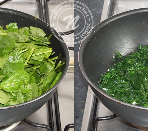Na tej samej patelni podduś też szpinak z przeciśniętym czosnkiem. Dopraw solą i gałką muszkatołową. Ważne, żeby szpinak nie pływał w wodzie - jeśli taka się pojawi, to poczekaj aż odparuje. Odstaw.
