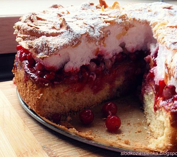 Po miesięcznej nieobecności czas powrócić do pieczenia i blogowania. W zanadrzu mam już parę fajnych słodkości które zrobiłam. Także powolutku będę je dawkować. Dziś przepyszne ciasto z wykorzystaniem porzeczek z ogródka Mamy oraz jej dżemu truskawkowego. Ciasto polecam szczególnie osobom, które lubią przełamywać smaki tak jak w tym przypadku kwaśne ze słodkim.SKŁADNIKI: na ciasto:5 jajszczypta soli150 g cukru1 opakowanie cukru waniliowego125 g maki na bezę:4 białka3/4 szklanki cukru pudruoraz:400 g porzeczek białych i czerwonychokoło 6 łyżek dżemu słodkiego (ja skorzystałam z truskawkowego)płatki migdałówcukier puderJaja ubijamy ze szczyptą soli oraz cukrem i cukrem waniliowym. Do ubitej masy stopniowo dodajemy przesianą mąkę. Gotowe ciasto przekładamy do tortownicy 24 cm natłuszczonej i obsypanej bułka tartą. Pieczemy w 180 st. C, 30 minut. Wystudzamy.Na ostudzone ciasto rozsmarowujemy dżem, na wierch układamy porzeczki.Białka (ważne aby były w temperaturze pokojowej) ubijamy na sztywno, stopniowo dodajemy cukier puder i nadal ubijamy. Wykładamy na porzeczki, wyrównujemy.Całość posypujemy płatkami migdałów i pieczemy w temperaturze 170 st. C przez 20 minut.Gotowe, ostudzone ciasto posypujemy cukrem pudrem.