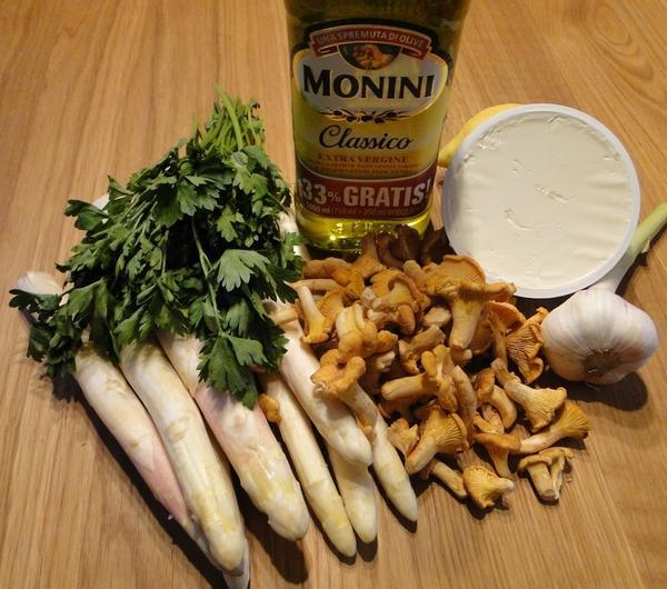 Szparagi obrać ( tak jak tutaj ). Pokroić ukośnie na 2-3 centymetrowe kawałki. Obgotować w wodzie z