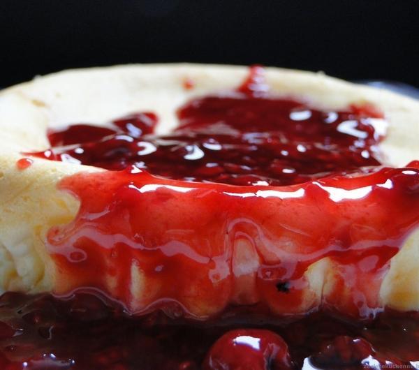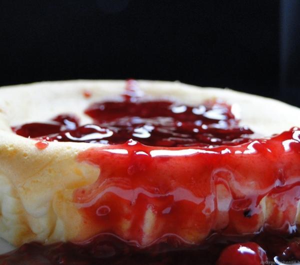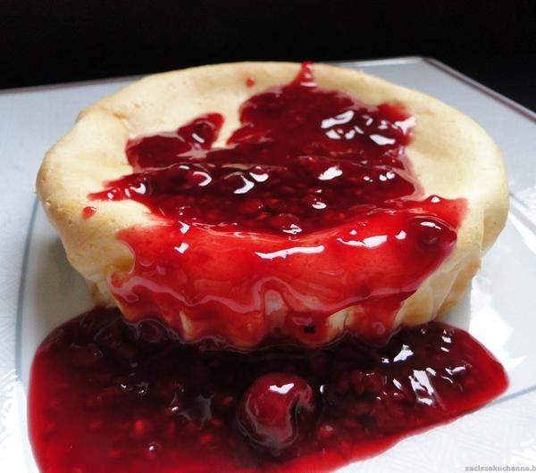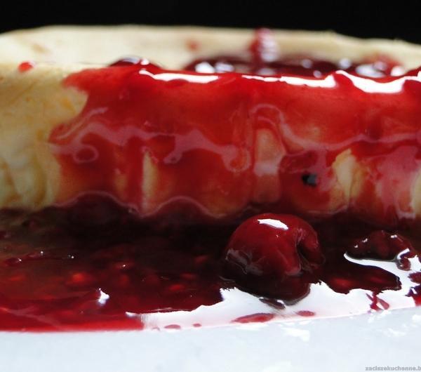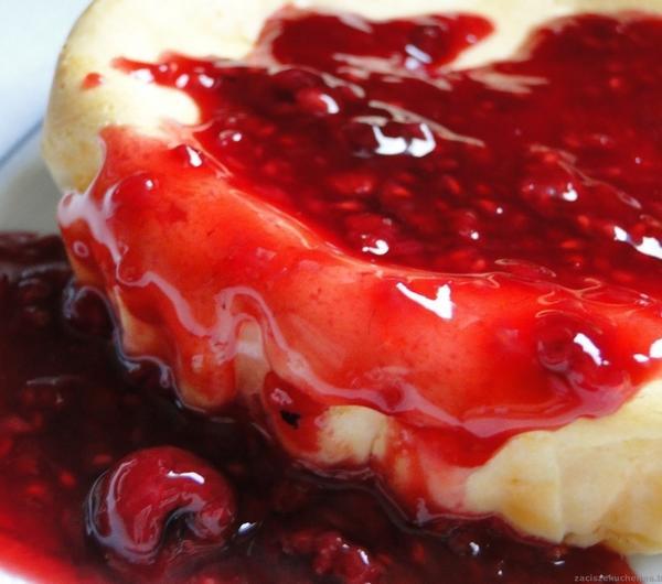 Ponieważ jest to mój pierwszy sernik chciałam się do tego przygotować i poczytać o tradycjach jego wypieku. Jedną z ciekawostek jest to, że już w czasach starożytnej Grecji karmiono olimpijczyków tym wspaniałym ciastem. Pochodzenie zatem sięga czasów starożytnego Rzymu i Grecji, więc już ponad 2 tys. lat. Przez podboje Rzymian rozprzestrzenił się na całą Europę , a razem z kolonistami, dotarł do Ameryki Północnej i tam ewoluował. W 1872 roku w Nowym Jorku przypadkowo odkryto produkowany do dzisiaj serek Philadelphia, który pozwolił zmodyfikować serowy przepis. Lekki i delikatny "sernik nowojorski" (New York Cheesecake) funkcjonuje do dziś.Najbardziej tradycyjna forma nazywana jest " sernikiem wiedeńskim" i pochodzi z krajów niemieckojęzycznych. W tej wersji zakłada dodanie do serowej masy dużej ilości bakalii. W krajach prawosławnych, popularna jest natomiast odmiana sernika na zimno, nazywana paschą.A Wy jaki preferujecie?Przy wypieku mojego sernika posiłkowałam się przepisem mojej mamy, a ona dostała go od swojej siostry. Widzicie więc, że źródła odnośnie autora nie posiadam, bo pewnie receptura przekazywan a jest z rąk do rąk:-). Z podanej porcji udało mi się upiec 1 du ż y i 1 mały sernik. Wszystko zależy od wielkości tortownicy.Składniki:1 kg sera mielonego (ja użyłam sera President w kubełku),15 dkg cukru,4 jajka,torebka budyniu waniliowego bez cukru,cukier waniliowy,2 łyżki mąki pszennej,2 łyżki mąki ziemniaczanej,1 łyżeczka proszku do pieczenia,0,5 litra śmietany 30 % tł.,sos z malinami:30 dkg mrożonych malin ( mogą być świeże),pół szkl. nalewki malinowej ( własnej roboty),pół szkl. soku malinowego,3 łyżki cukru,pół szkl. wody,1-2 łyżeczki mąki ziemniaczanej.Przygotowanie:Żółtka utrzeć z cukrem i cukrem waniliowym, dodać ser, mąkę, budyń, proszek do pieczenia i wszystko zmiksować. Oddzielnie ubić śmietanę oraz białka. Wszystko delikatnie wymieszać razem. Wylać masę do tortownicy wyłożonej papierem do pieczenia. Piec w 130 stopniach przez około 2h ( żeby nie opadł) lub do złocistego koloru.Wszystkie składniki bez mąki wymieszać podgrzewając do momentu rozpuszczenia się cukru.Mąkę rozprowadzić w odrobinie wody i zagęścić sos. Polewać sernik dowolna ilością.