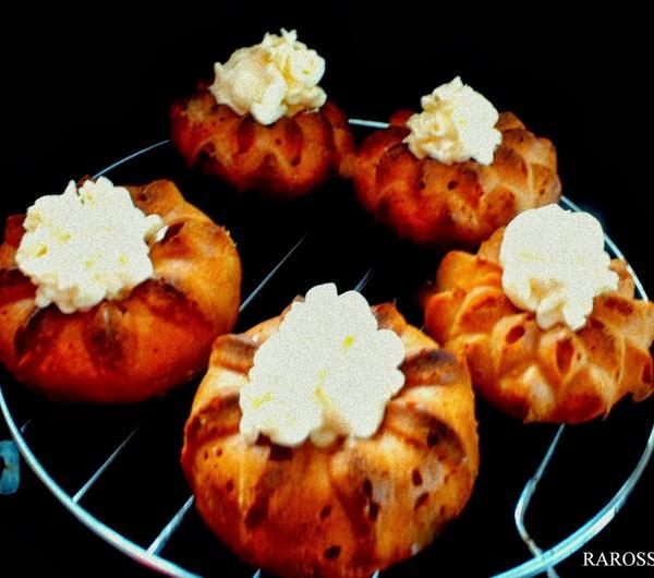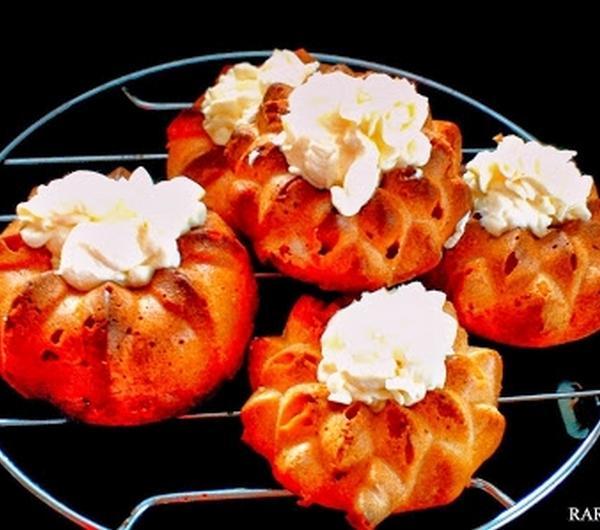 Przygotowanie:Pokruszone drożdże rozetrzeć z łyżeczką cukru, letnim mlekiem oraz łyżką mąki Przykryć ściereczką i odstawić w ciepłe miejsce do wyrośnięcia. Masło stopić, odstawić do przestudzenia. Mąkę wymieszać z cukrem, solą dodać, a następnie wyrośnięte drożdże. Dokładnie wymieszać. Wyrabiać ok. 5 minut. Ciasto powinno być sprężyste, dodać stopione masło i dalej wyrabiać do momentu aż ciasto będzie odstawać od ręki. Ciasto powinno być dość luźne. Przykryć miskę ściereczką i odstawić w ciepłe miejsce, by ciasto wyrosło – powinno podwoić swoją objętość. Po wyrośnięciu przebić ciasto pięścią. Nakładać do połowy wysokości foremki. Przykryć ściereczka i odstawić do ponownego wyrośnięcia na 30 min. Piec około 20-25 minut w temperaturze 180 °CPrzygotować syrop:W rondlu zagotować wodę z cukrem, aromatem oraz alkoholem gotować aż cukier zupełnie się rozpuści.Ciastka zanurzać 20 sekund w syropie następnie i ułożyć na kratce, żeby obciekły. Kremówkę ubić na sztywno, pod koniec ubijania dodać cukier puder. Gotową śmietaną dekorować ciasteczka.Smacznego :)