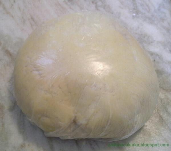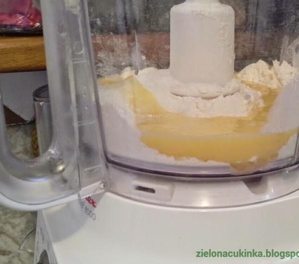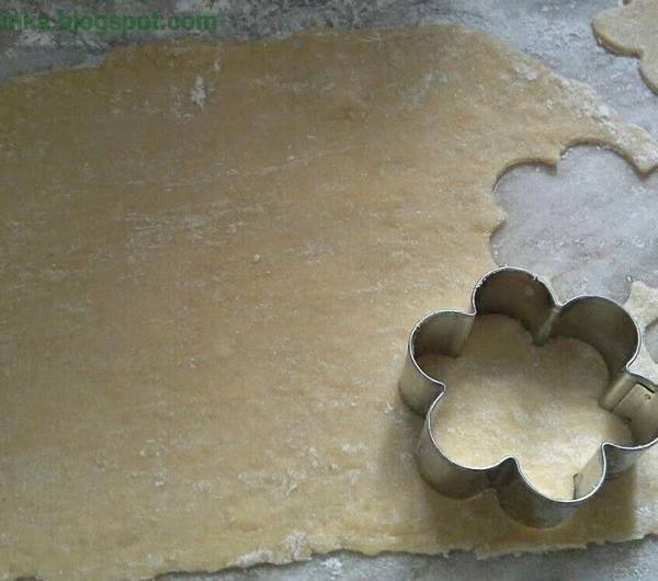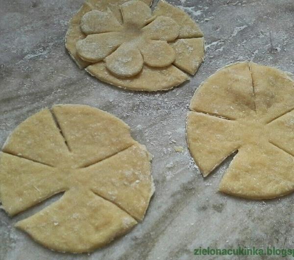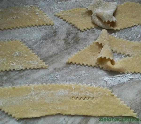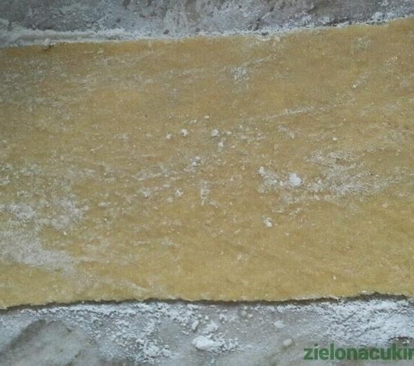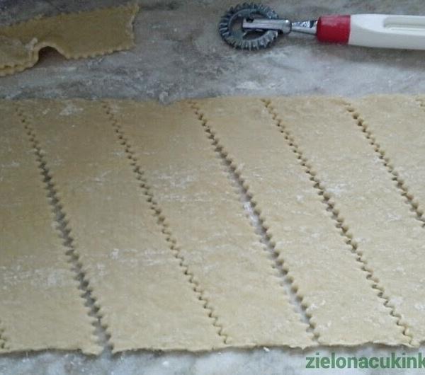 Uformować kulę, owinąć folią spożwczą. Zostawić ciasto w temperaturze pokojowej na pół godziny. Rozwałkować cienko na stolnicy ( około 2-3 mm i wycinać paski o długości 10 cm i szerokości 3 cm. W razie potrzeby podsypać mąką.