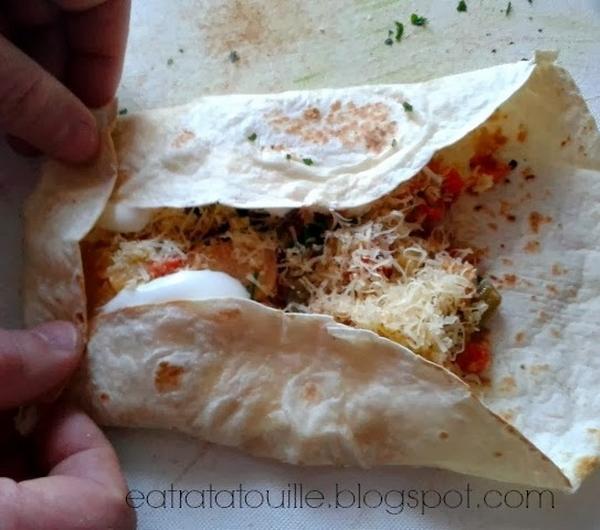 Mięso pokrój w grubą kostkę. Posyp ziołami z saszetki, skrop oliwą i sokiem z limonki. Zostaw na pół godziny. Cebulę i czosnek drobno posiekaj i przesmaż na rozgrzanej oliwie. Dodaj mięso i smaż kilka minut. Dodaj warzywa i duś do miękkości. Ułóż na ciepłej tortilli, posyp pietruszką, serem żółtym i polej łyżką śmietany. Zawijaj tak jak na zdjęciu po czym złóż na pół.