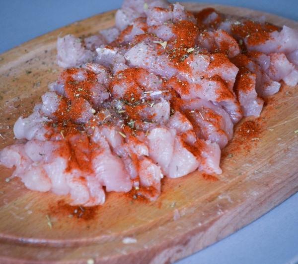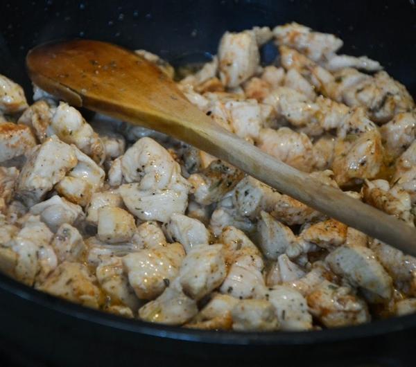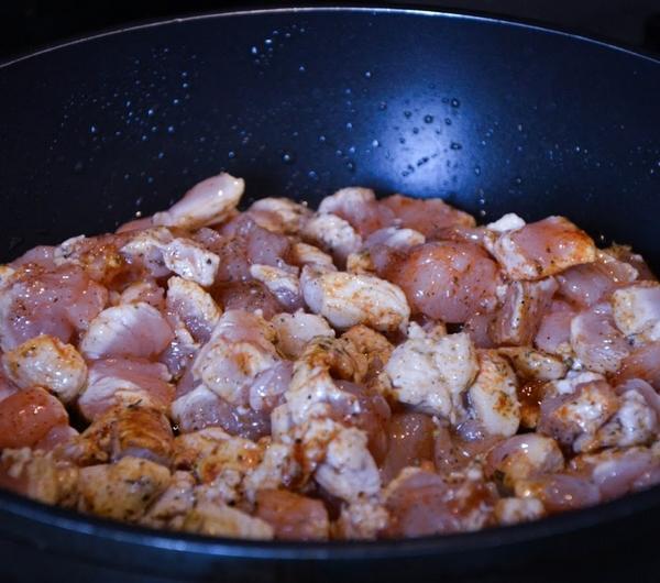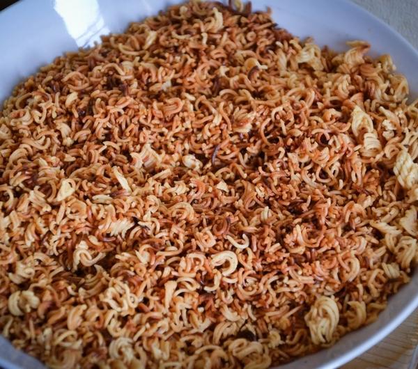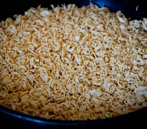 3. Kiedy kurczak jest gotowy, zdejmujemy go do miski, aby wystygł. Na tłuszcz pozostały na patelni, wysypujemy 3 paczki samego makaronu z zupek chińskich. Smażymy na złoty kolor, po czym również pozostawiamy do wystygnięcia.