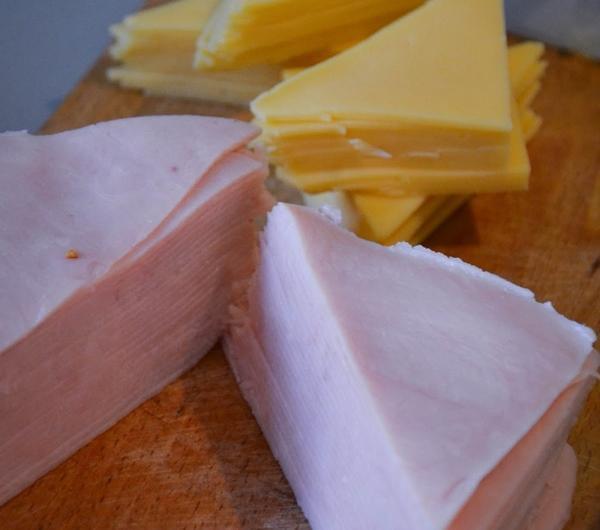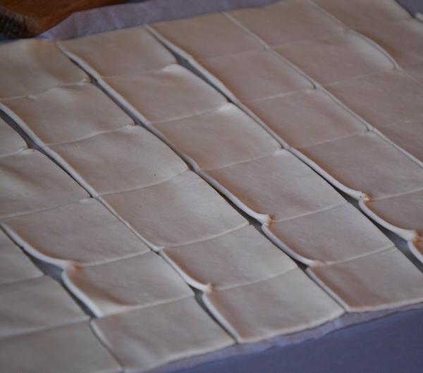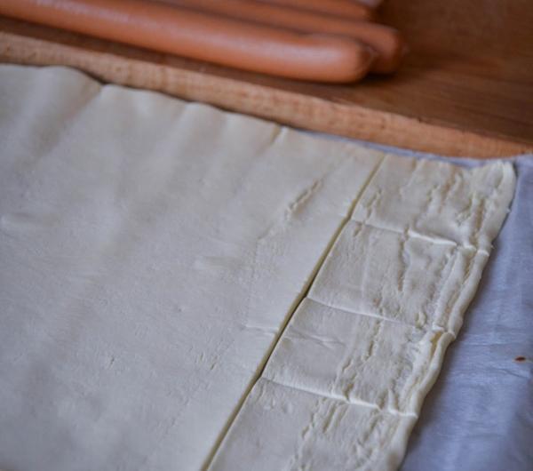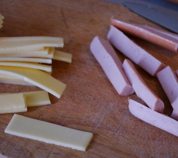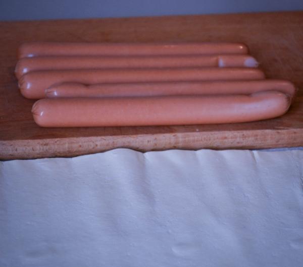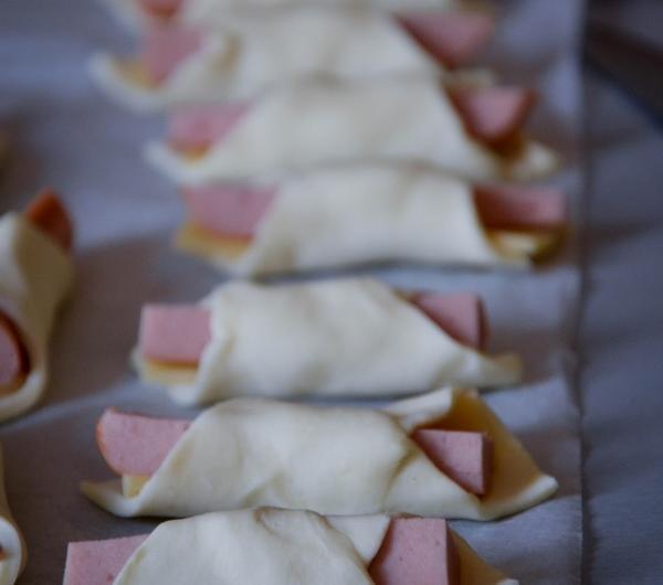 3. Ostatni etap to położenie sera i parówki po przekątnej kwadracika i połączenie przeciwległych rogów. Można z góry posmarować rozbełtanym białkiem.
