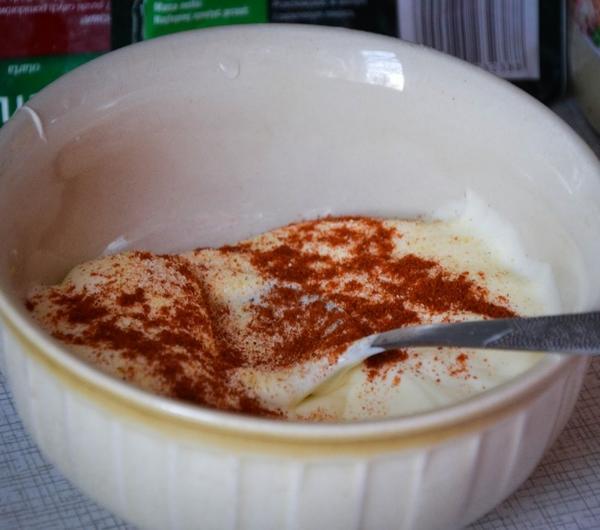 6. Do małej miseczki przekładamy majonez, dodajemy do niego w/w przyprawy, mieszamy na gładką masę. Dodatkowo, zamiast soli, wrzucamy przyprawy pozostałe z zupek chińskich.