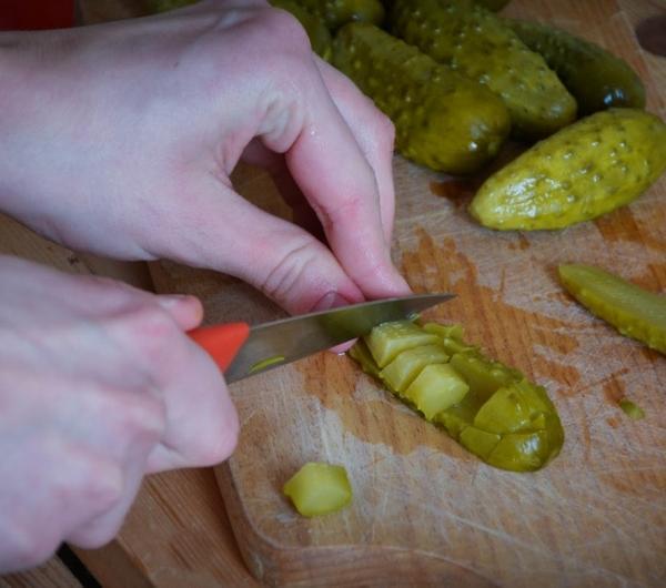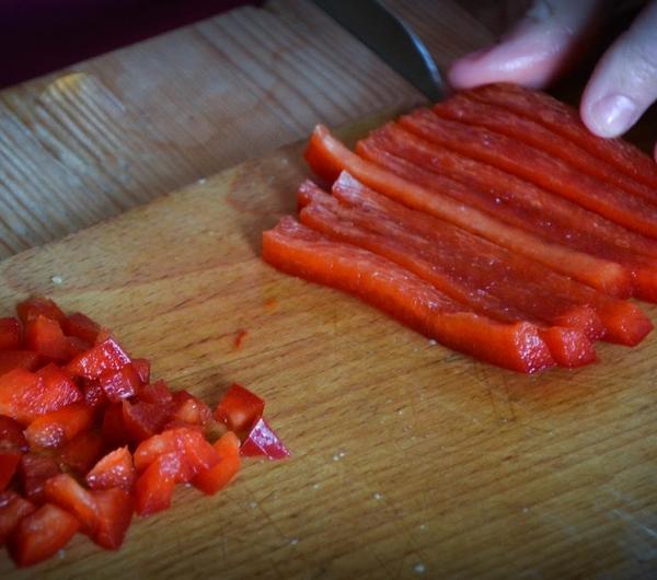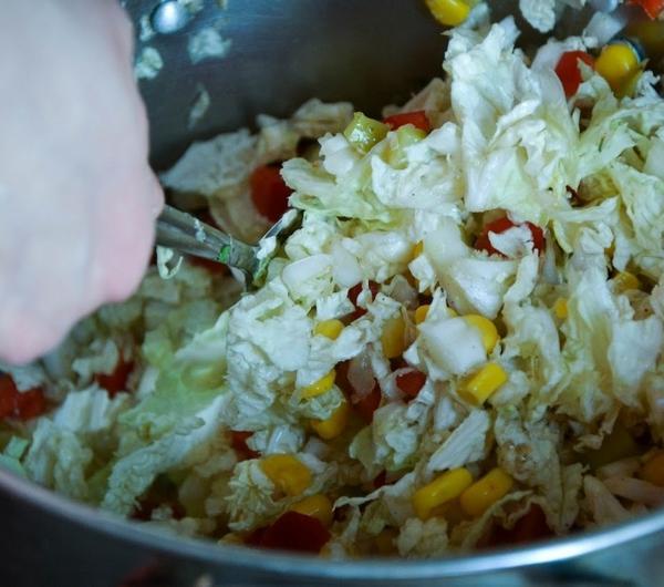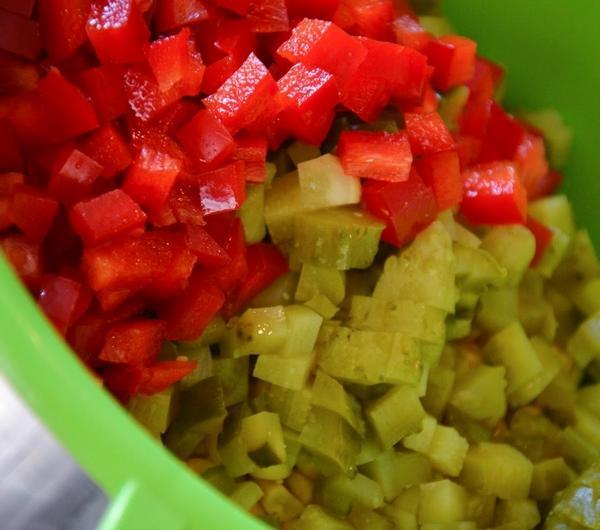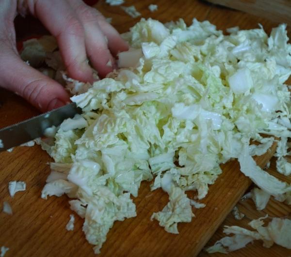 2. W tym czasie kroimy paprykę, ogórki w kostkę. Wypłukaną kapustę rwiemy na kawałki, lub kroimy nożem.