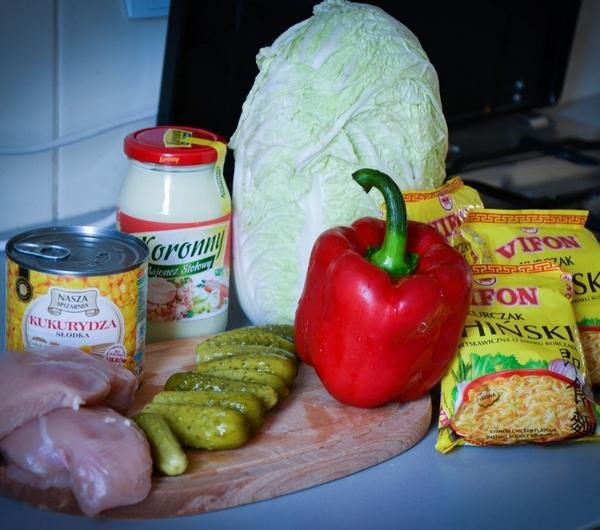 Nr 1 Sałatka Pauli, składniki:-1 kapusta pekińska; 3 zł- 3 zupki chińskie najlepiej pikantne; 5 , 40 zł- 1 papryka czerwona; 1,60 zł- mały słoik korniszonów; 4 zł- mały słoik majonezu; 1,99 zł- puszka kukurydzy; 1,99 zł- 2 piersi z kurczaka; 8 zł- przyprawa do kurczaka- papryka słodka- czosnek granulowany (może być świeży)- sól i pieprzCzas przygotowania: 45 minKoszt: ok. 27 złPrzygotowanie:1. Pierś z kurczaka kroimy w kostkę, przyprawiamy papryką, solą, pieprzem, przyprawą do kurczaka. Obtoczonego w przyprawach wrzucamy na rozgrzaną patelnię z olejem.