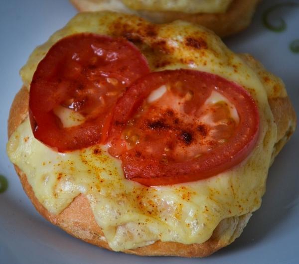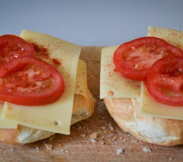 5. Wszystko przykrywamy serem, na niego kładziemy po plasterku pomidora, posypujemy ostrą papryką.