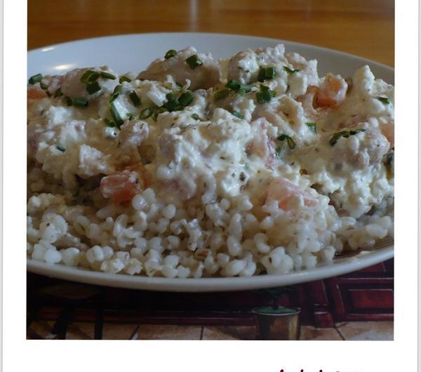Niedawno wymyśliłam taką wariację na danie z gotowanego mięsaSkładniki na 2-3 porcje:25-30 dag piersi z indyka lub kurczaka500ml bulionu mięsnego (może byćz kostki)łyżka masłaszklanka śmietany 18%25 dag twarogu wiejskiego light (np. Piątnica)1 średni pomidorgarść ziaren słonecznikasól, pieprz, majeranekszczypiorekMięso, po umyciu i osuszeniu, pokroiłam w kostkę. Gotowałam 15 minut w bulionie mięsnym.W tym czasie rozgrzałam na patelni łyżkę masła, po czym powoli dolałam śmietanę, cały czas mieszając. Podgrzewałam na wolnym ogniu. Gdy była już wystarczająco ciepła, ale jeszcze przed zagotowaniem, zdjęłam z ognia. Dodałam twaróg i doprawiłam przyprawami.Pomidor po sparzeniu obrałam ze skórki i pokroiłam w drobną kostkę. Dodałam do masy śmietanowo-twarogowej wraz ze słonecznikiem. Dokładnie wymieszałam, dodałam ugotowane mięso i posypałam szczypiorkiem.Podałam z kaszą jęczmienną polaną tą drobiową potrawką.
