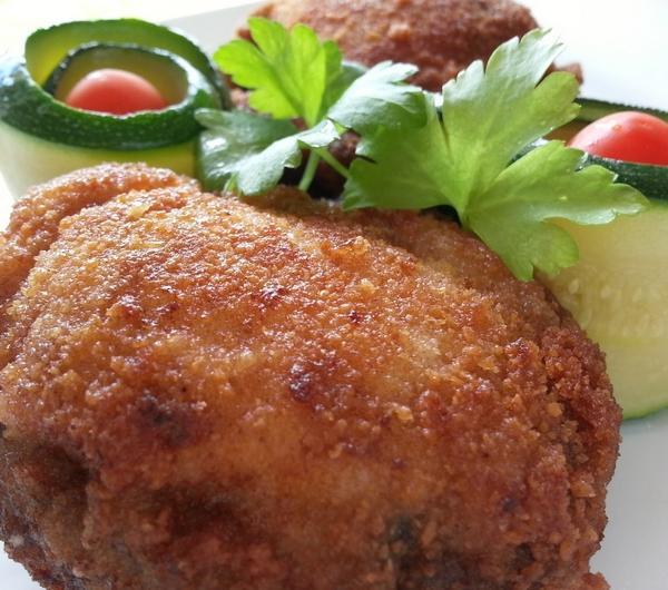 Składniki:- 4 filety z udek kurczaka,- 4 duże pieczarki,- 2 jajka,- bułka tarta,- sól, pieprz,- olej do smażenia.Pieczarki obrać i wydrążyć łyżeczką, delikatnie, żeby nie uszkodzić kapelusza. Filety z udek umyć i przyprawić do smaku. Do każdej pieczarki włożyć filet z udka, dokładnie obtoczyć w jajku, a następnie w bułce tartej. Smażyć na rozgrzanym oleju, na średniej mocy kuchenki, na złoty kolor. Podawać z czym tylko macie ochotę.