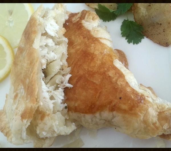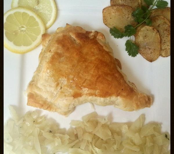 Składniki:- 1 opakowanie ciasta francuskiego,- 3 filety ryby (dowolny rodzaj ryby),- 1 główka kapusty,- 1 cebula,- sól, pieprz do smaku,- maggi do smaku,- 2 łyżki masła,- cukier do smaku,- 1 cytryna,- 1 jajko.+ smażone plasterki ziemniaka (w przyprawie do ziemniaków)Na początek trzeba przygotować kapustę, obrać z pierwszych liści, przeciąć na pół, umyć i wyciąć głąb. Poszatkować kapustę, następnie włożyć do garnka i wlać ok. 2 szklanki wody, przykryć i dusić do miękkości, od czasu do czasu mieszając. Na patelni rozgrzać masło i dodać pokrojoną w paski cebulę. Zeszklić. Do kapusty dodać cebulkę i przyprawy. Sól i pieprz do smaku i kilka kropel Maggi, można dodać cukier i skropić cytryną.Ciasto francuskie rozwinąć, a na nim położyć filet z ryby, przyprawić solą i pieprzem, kilkoma kroplami maggi i skropić sokiem z cytryny, przykryć kapustą i zawinąć w ciasto. I tak każdą rybę po kolei. Roztrzepać jajko i posmarować wierzch ciasta. Ułożyć na wysmarowanej tłuszczem blasze. Piec w rozgrzanym piekarniku do 180st. C przez 25-30 min.