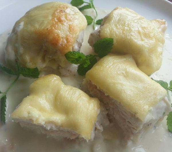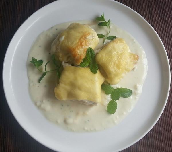 Składniki:- filet z piersi kurczaka,- 4 plastry szynki,- 6 plastrów sera żółtego- 150 ml śmietany (12%),+ 100ml zimnej wodyFilet z piersi kurczaka pokroić na 4 plastry. Rozibic kotelty tluczkiem, przyprawić solą i pieprzem do smaku, na każdym położyć plasterek szynki i sera. Pozwijać w roladki, każdą roladkę przekroić na pół. Ułożyć w żaroodpornym naczyniu łączeniem do dołu. Zawartość torebki "Pomysł na...roladki schabowe w sosie serowym" dobrze wymieszać z 150 ml śmietanki 12% i 100 ml zimnej wody. Cały czas mieszając, doprowadzić do wrzenia (nie gotować!), zdjąć z ognia i zalać roladki. Na każdej położyć ćwierć plastra żółtego sera. Włożyć naczynie do rozgrzanego piekarnika do 180°C. Piec ok. 35 min.