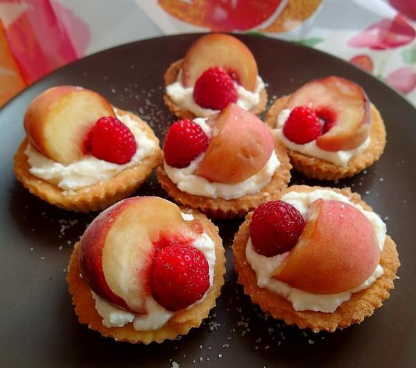 12 dag masła10 dag mąki krupczatki8 dag cukru pudruNa stolnicy usypuję kopczyk z mąki i cukru, dorzucam zimne masło posiekane na małe kawałki i wyrabiam ciasto. Gdy składniki dokładnie wymieszają się ze sobą formuję z ciasta kulę i owijam folią spożywczą i wkładam do lodówki na 1 godzinę.Schłodzone ciasto rozwałkowuję na cienki placek (około 3mm) i dużą szklanką wykrawam koła. Ciasto układam w wysmarowanych masłem foremkach i wstawiam do piekarnika nagrzanego do 180 stopni Celsjusza. Piekę około 15 minut, aż się zezłocą.Podaję je z dżemami, kremami, bitą śmietaną. Hitem są u mnie babeczki z plastrami banana i czekoladową polewą**.Na zdjęciu babeczki z waniliową ricottą (ricotta+ ekstrakt z wanilii +cukier wg uznania), brzoskwiniami Paraguayo i malinami, posypane odrobiną cukru pomarańczowego.Bardzo często piekę babeczki gdy mam "zbyt dużo wolnego czasu". Schowane w pudełkach dzielnie oczekują na swój czas. Nie tracą świeżości, nie miękną, a zawsze tuż przed podaniem można je lekko podgrzać w piekarniku i zaskoczyć niespodziewanych gości ciepłym wypiekiem.* Moja rodzina to prawdziwi pożeracze babeczek, dlatego zawszę piekę na raz przynajmniej 5 porcji.** Znikają zanim zdążę wrócić do kuchni z aparatem, czyżby nie lubiły pozować do zdjęć?