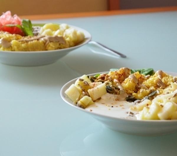 miodem, tahini oraz wiórkami kokosowymicorn grits