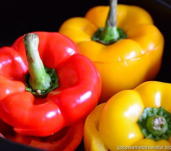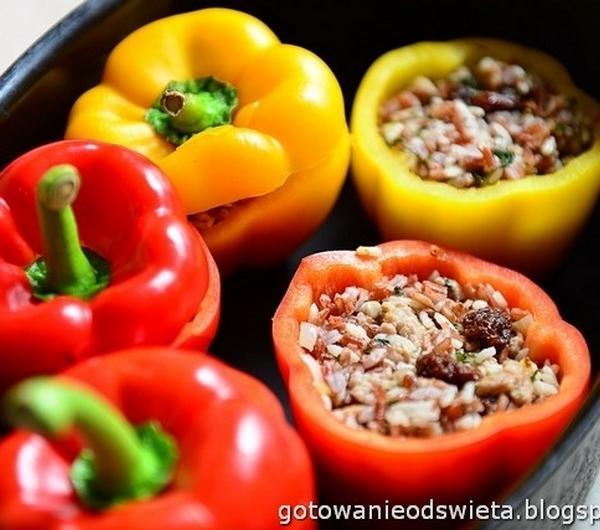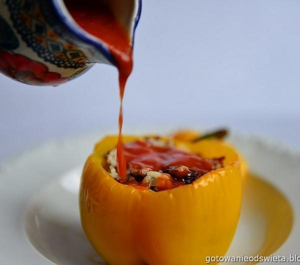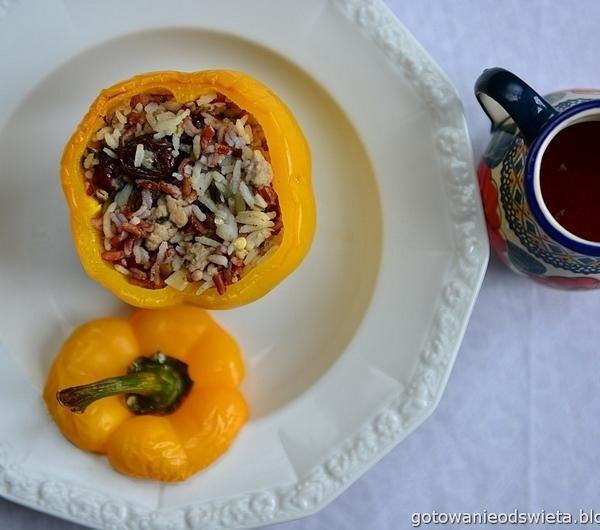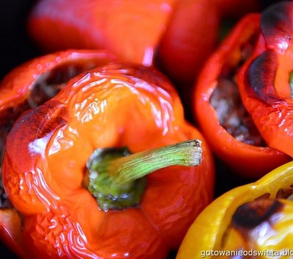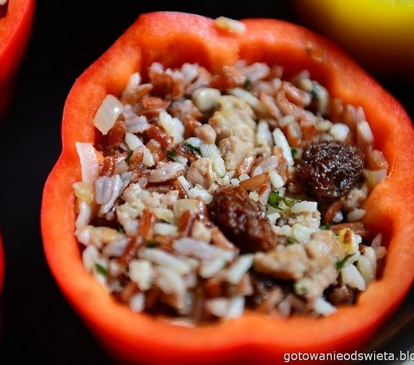 Wspaniałe danie. Bardzo aromatyczne, o intensywnym smaku przypraw i ziół. Dla mnie odkrycie ostatnich miesięcy. Do tego świetnie się prezentuje i wbrew pozorom nie przysparza zbyt wiele pracy.Przygotowanie tej potrawy można zresztą rozłożyć na raty: najpierw przygotować farsz a pieczenie papryk pozostawić na moment przed samym podaniem.Za chwilę zacznie się sezon na paprykę, warto zatem już dziś zaplanować sobie w menu poniższy przepis. Danie jest pyszne, zdrowe i szybkie. Polecam!Potrzebujesz:8 papryk,40 dag mielonego mięsa (wołowina lub indyk),20 dag ryżu (może być ciemny lub dziki),2 cebule drobno posiekane,2 ząbki czosnku drobno posiekane,2 cytryny,1 łyżka prażonych ziaren słonecznika,1 łyżka rodzynek,1 pęczek natki pietruszki drobno posiekanej,2-3 łyżki posiekanej świeżej mięty,około 6 łyżek oliwy,2 łyżeczki kminku w proszku,1 łyżeczka imbiru w proszku,300 ml przecieru pomidorowego,sól, pieprzWykonanie:Ugotuj ryż zgodnie z instrukcją na opakowaniu. Po ugotowaniu przełóż do sporej miski. Na łyżce oliwy podsmaż posiekaną cebulę i czosnek tak, aby były przyrumienione. Podsmażoną cebulę i czosnek wymieszaj z ugotowanym ryżem.Na patelni po cebuli rozgrzej kolejną łyżkę oliwy, podsmażaj na niej mięso przez kilka minut dość często mieszając. Podsmażone mięso wymieszaj z ryżem a następnie dodaj rodzynki, słonecznik, kminek, imbir, połowę mięty, pietruszkę i sok z cytryn. Posól i popieprz do smaku i całość dokładnie wymieszaj.Odetnij górne części papryk i odłóż je na bok. Ze środka papryk wyjmij pestki. Do każdej nałóż farsz z ryżu i mięsa, następnie przykryj je odłożoną "czapeczką" z papryki. Tak przygotowane papryki wstaw do naczynia do zapiekania, polej je pozostałą oliwą i piecz około 40 minut w piekarniku nagrzanym do 180 stopni C.Przecier pomidorowy wlej do małego garnuszka, podgrzej, dopraw pozostałą miętą, solą i pieprzem. Podawaj jako sos do pieczonej papryki.