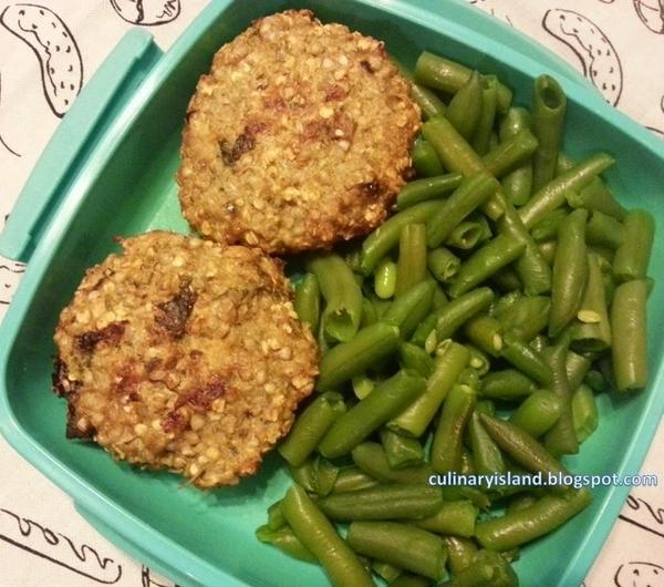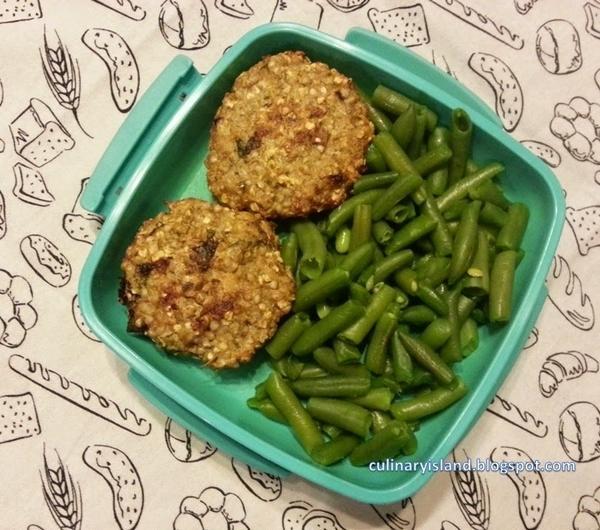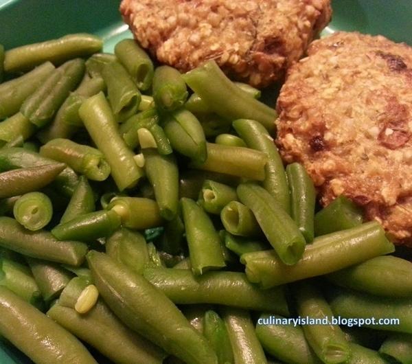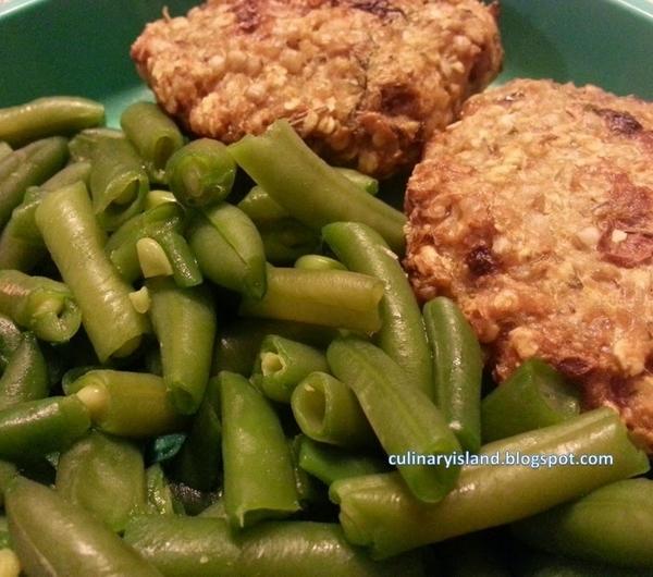 Kotlety zjadłam z zieloną fasolką szparagową (z mrożonki) - były pyszne, choć przyznam, że pewnie jeszcze lepsze byłyby z jakimś sosem, np. naturalny jogurt z przyprawami i czosnkiem. Sos by nieco nawilżył te kotlety.