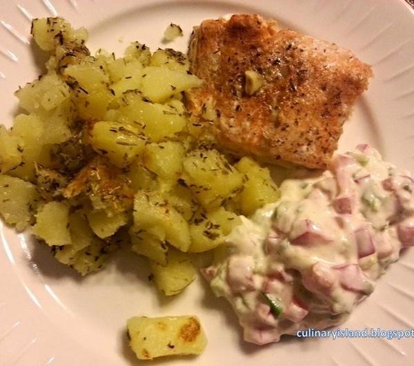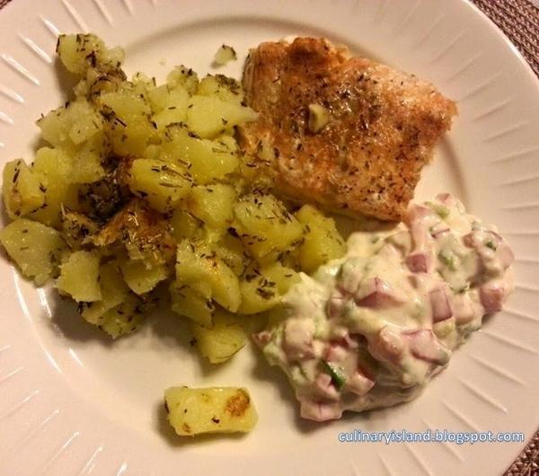 4. Pieczony łosoś i ziemniaki z sosem z czerwoną papryką i szczypiorkiem
