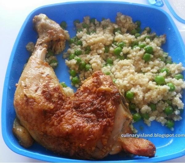 7. Kolejna propozycja obiadu do pracy to pieczone udko (zjadam bez skóry) z kaszą jaglaną, którą wymieszałam z ugotowanym groszkiem.