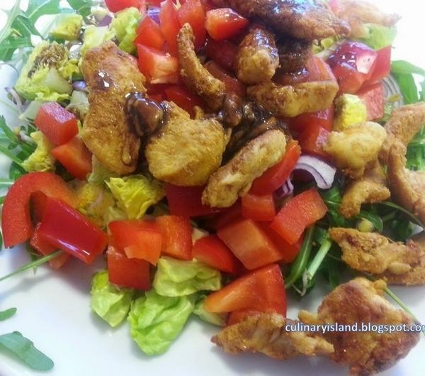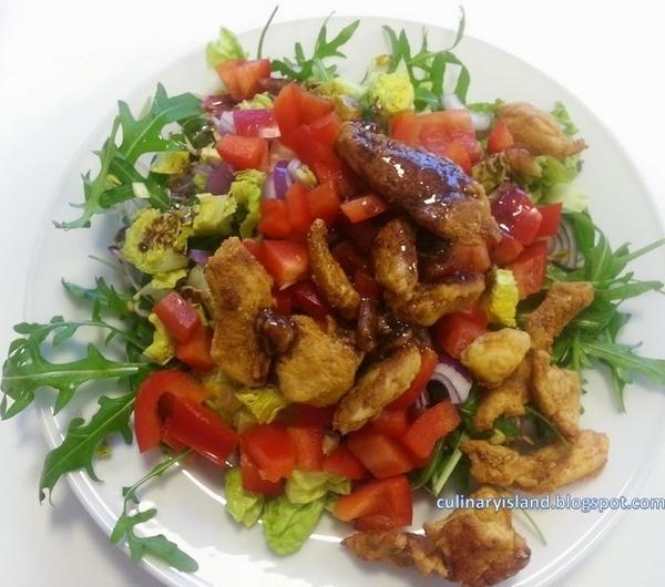2. Moja obiadowa sałatka. Czasami nie mam czasu na ciepły obiad, więc zabieram ze sobą sałatę, mieszam i gotowe. Tym razem z kurczakiem, czasami z mozzarellą, fetą albo tofu.I mój przepis na pyszny dressing : oliwa z oliwek, miód, musztarda z gorczycą, ocet balsamiczny (mój z figami) i zioła.