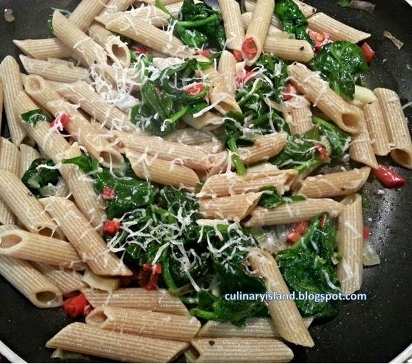 6. Makaron - tym razem szpinak z chili posypany startym serem kozim. Rozpusta :)