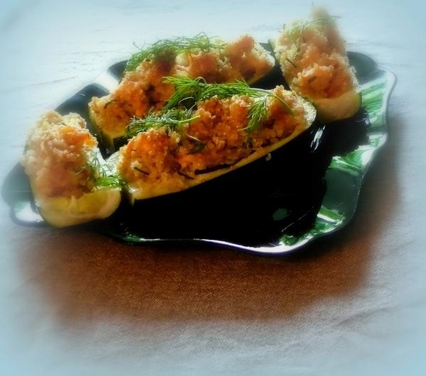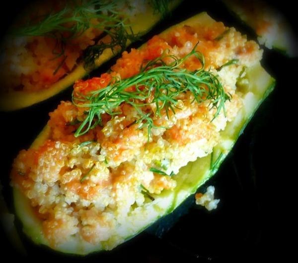 Cukinię kroimy wzdłuż i na pół i drążymy środki tak aby powstały 4 łódeczki.