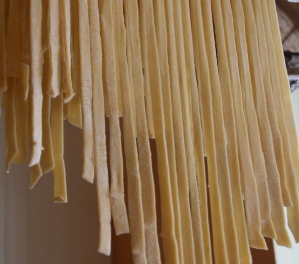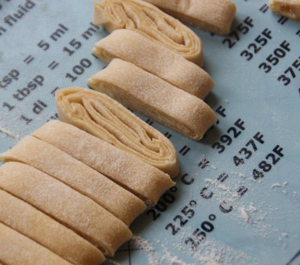 mąką, zwinęłam w rulon i pocięłam na kawałki około 7mm szerokości. Pojedyncze wstążki rozwiesiłam do lekkiego obsuszenia. Część zjedliśmy od razu a część zwinęłam w gniazdka i zostawiłam aż całkiem wysechł, będzie na później.