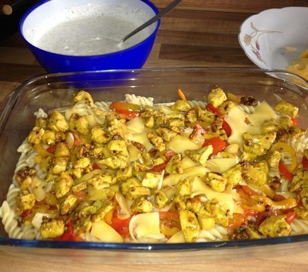 makaron.2. Pierś pokroić w kostkę, przyprawić i usmażyć.3.