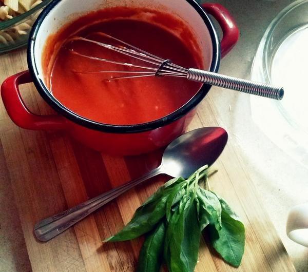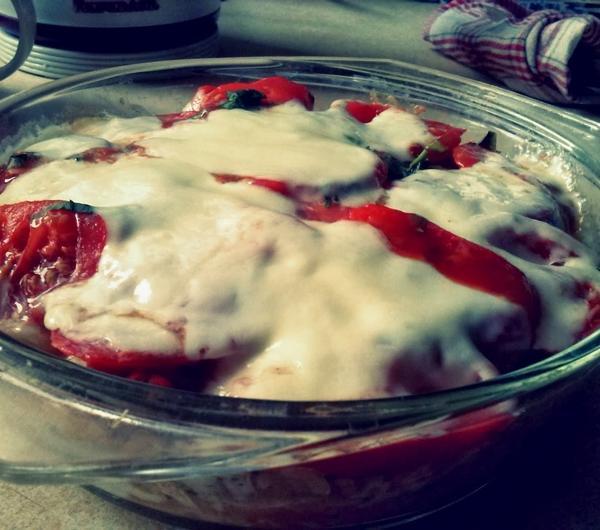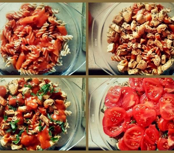 Należy pamiętać, że sos powinien być bardzo gęsty, aby warstwy zapiekanki trzymały się w całości. Pomidory podczas pieczenia stracą swoją wodę, więc nie należy bać się, że makaron będzie suchy.Ostatnim etapem jest układnie przygotowanych składników: smarujemy dno naczynia żaroodpornego sosem, wsypujemy cały makaron, następnie układamy kurczaka, polewamy sosem, a także posypujemy bazylią, kolejno układamy pomidory, a na końcu pokrojoną mozzarellę. Całość włożyłam do mikrofalówki włączając funkcję piekarnika. Piekłam w temperaturze 400 st przez 7 min.