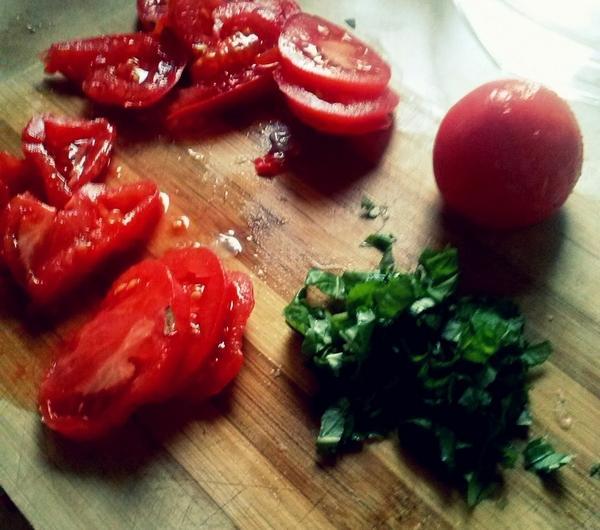 Cedząc makaron polewamy zimną wodą, aby się nie posklejał i odstawiamy na bok. Zamarynowane kawałki piersi z kurczaka wrzucamy na rozgrzana patelnię z odrobiną oliwy. Smażymy je ok. 7 min, możemy posypać je ziołami prowansalskimi i suszoną bazylią. Pomidory zalewamy gorącą wodą, a następnie obieramy ze skórki. Kroimy mozzarellę i pomidory, siekamy listki bazylii.