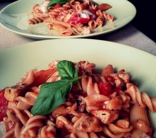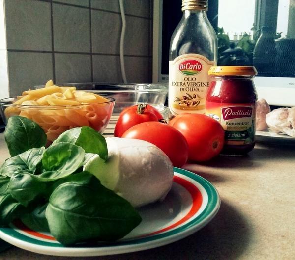 Składniki:- 1/2 opakowania makaronu- 1 kostka rosołowa- 3 łyżki przecieru pomidorowego z ziołami- 1 łyżka mąki- 8 listków świeżej bazylii- 1 opakowanie mozzarelli- 1 pierś z kurczaka- 3 pomidory- oliwa- przyprawy: pieprz, sól, chilli, zioła prowansalskieWykonanie:Zaczynamy od przygotowania kurczaka. Kroimy w kostkę opłukaną i osuszoną pierś z kurczaka. Posypujemy przyprawą do kurczaka i mieszamy razem z łyżką oliwy. Odstawiamy na 10-15 min. W tym czasie wstawiamy wodę na makaron i gotujemy go zgodnie z instrukcją na opakowaniu - może być 2-3 min krócej, ważne aby nie rozgotować makaronu. Następnie przygotowujemy sos pomidorowy. Do małego garnuszka wlewamy dwie szklanki wody i wrzucamy kostkę rosołową. Gdy kostka się rozpuści dodajemy przecier pomidorowy, chwilę zagotowujemy, a następnie dodajemy w celu zagęszczenia po trochę mąki rozpuszczonej w wodzie. Całość doprawiamy pieprzem, sproszkowaną papryką chilli i ziołami.