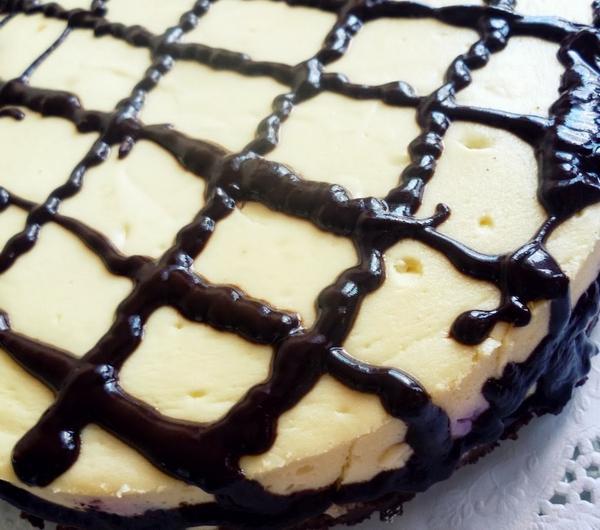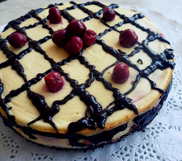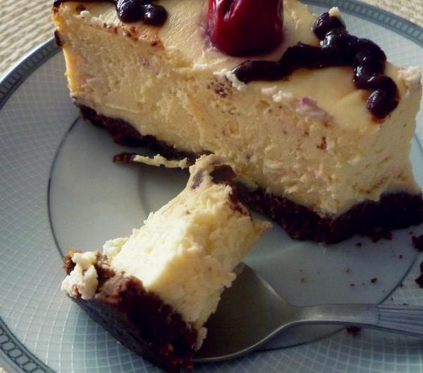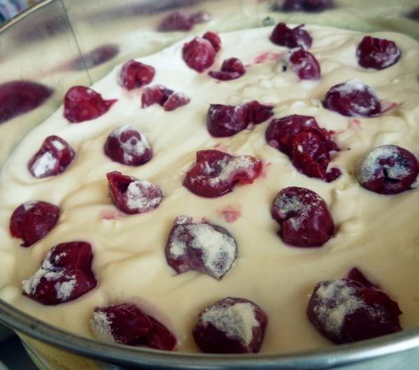 mąką, żeby nie opadły na dno. Następnie wykładamy pozostałą część masy. Tortownicę wkładamy do piekarnika nagrzanego do temperatury 160 st i pieczemy przez 1 h 25 min . Po upieczeniu nie wyciągamy sernika. Uchylamy piekarnik i czekamy aż ostygnie.