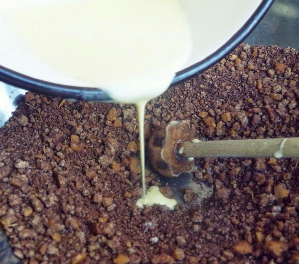 Wykonanie:Ciasta zbożowe wsypujemy do miski i rozgniatamy na pył. Następnie dodajemy 2 łyżki