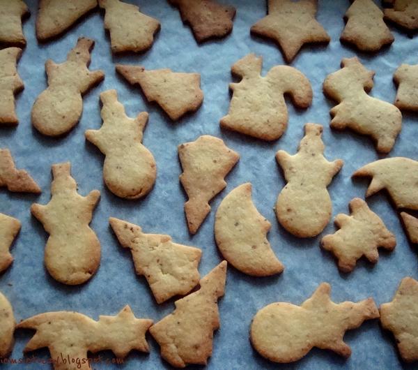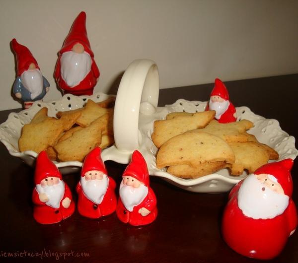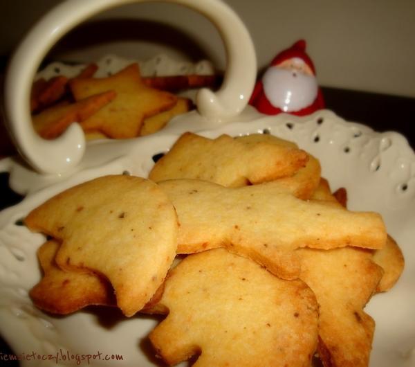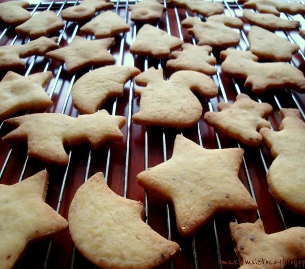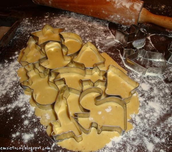 skórki cytrynowej (opcjonalnie)PrzygotowanieWszystkie składniki wrzucić do malaksera i miksować aż się połączą i utworzą zwartą masę.Uformować kulę i chłodzić w lodówce przez ok. 2 godziny (ja wystawiłam na godzinę na taras).Nagrzać piekarnik do temp. 180 st. C.Ciasto rozwałkować na grubość ok. 3 mm, delikatnie podsypując