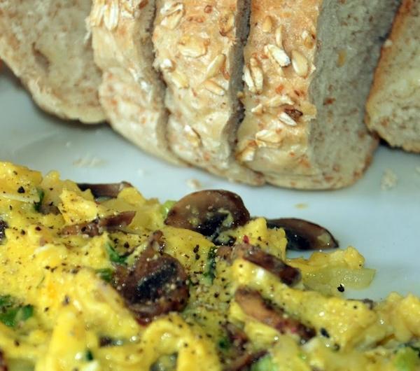 Pieczarki kroimy na pół, a następnie w półplasterki. Cebulkę w piórka, szczypiorek i czosnek niezbyt drobno. Na patelni rozpuszczamy masło i wrzucamy nasze dodatki. Chwilę podsmażamy. W tym czasie do kubka wbijamy jajka i roztrzepujemy je dokładnie widelcem. Masę jajeczną wlewamy na patelnię i znów chwilę smażymy, ale tak, by jajecznica pozostała dość luźna, a tym samym kremowa i niewysuszona. Doprawiamy solą i pieprzem. Podajemy z pieczywem, którego kromki możemy cieniutko posmarować majonezem. Wiem, że niezdrowo, ale co tam. Przecież nieczęsto jadamy takie śniadania, a to dla mnie idealny początek dnia.