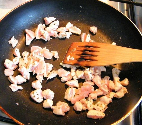 Pierś z kurczaka myjemy i drobno kroimy. Doprawiamy