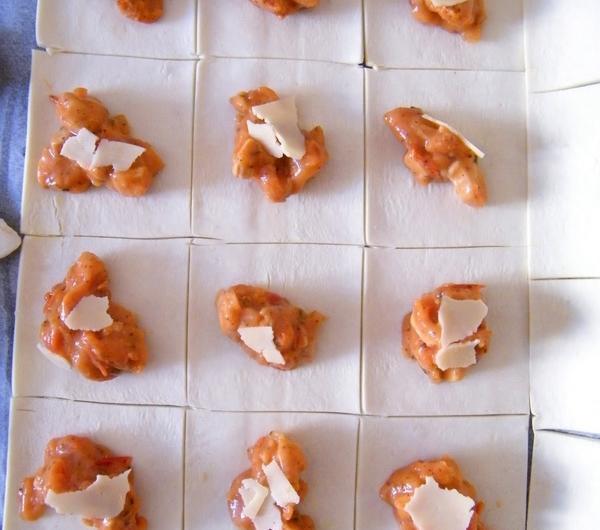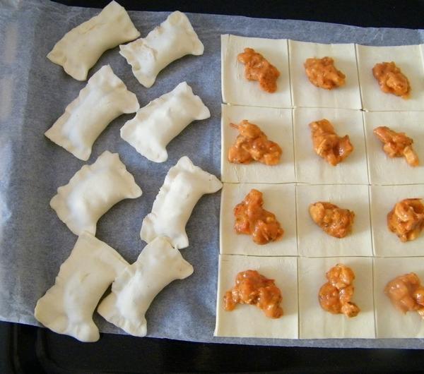ciasto francuskie (jeśli jest popękane, spróbujmy je skleić) i kroimy w kwadraciki (wielkość zależy od Was - jeśli będziecie umieli skleić niewielkie kawałki, dzielcie by wyszło jak najwięcej). Nakładamy farsz (tyle, ile jesteście w stanie skleić) i dodajemy po kawałku